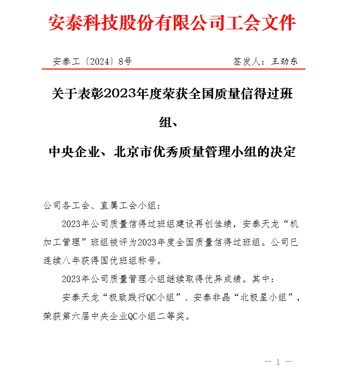 為鼓勵員工參與質量提升及改善活動,提高質量意識和創新能力,持續進行質量改善、降低消耗、提高工作效率,河冶科技-質管部超聲探傷QC小組榮獲中央企業、北京市優秀質量管理小組三等獎, 2023年安泰科技第十一屆優秀質量管理小組二等獎。